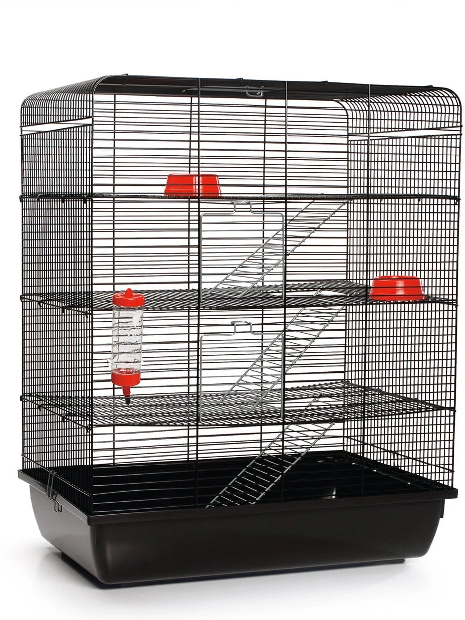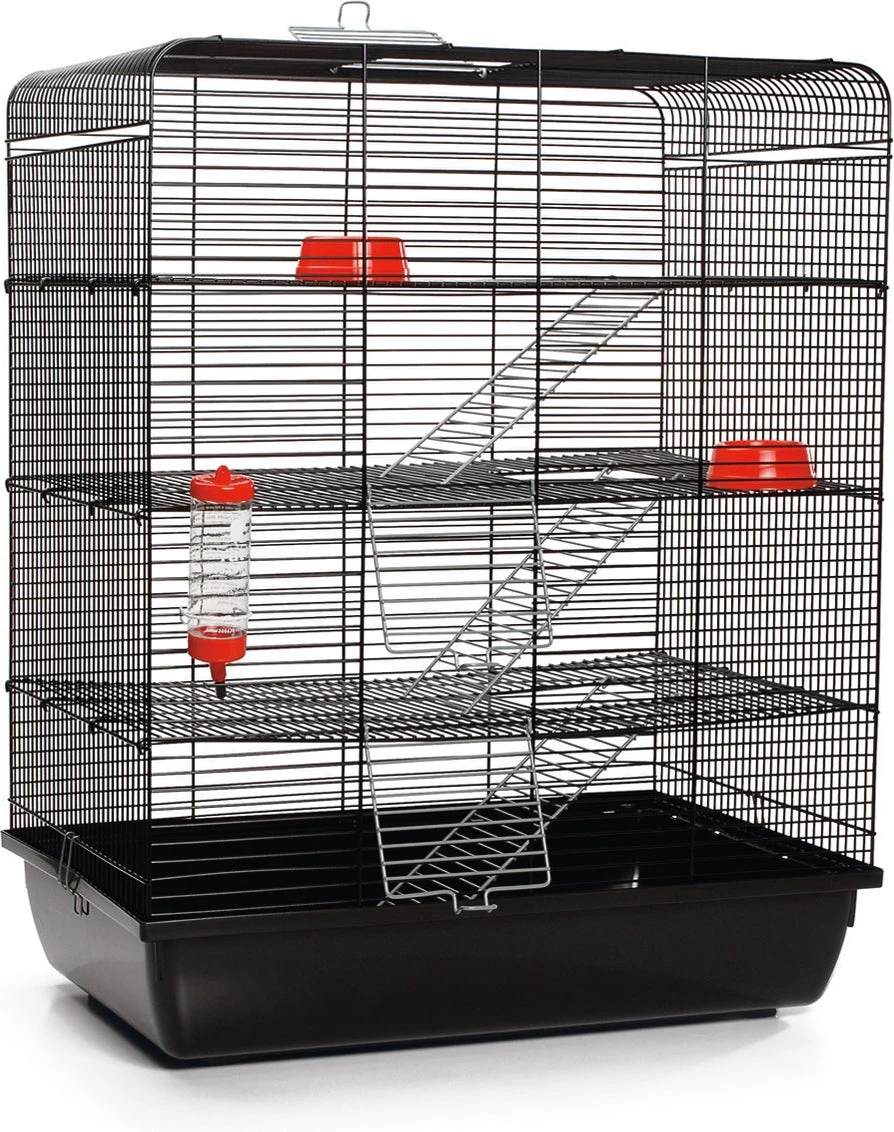 Een grote kooi vol met uitdagingen, dat is de Beeztees Remy kooi. Deze kooi heeft zeer fijn tralies en is voorzien van maar liefst 3 verdiepingen. Om bij deze verdiepingen te komen kan jouw knaagdier de metalen trapjes gebruiken. Natuurlijk moet er ook gedronken en gegeten worden, daarom zijn er een drinkfles en 2 voerbakken aanwezig.