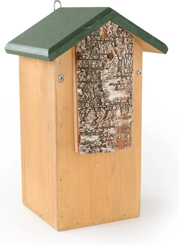 De nestkast specht Phoenix van CJ Wildlife heeft aan de voorkant een gedeelte dat is gemaakt van berk. Het heeft een heel klein voorgeboord gaatje. De specht kan zo de invliegopening van de nestkast zelf open en groter hakken.