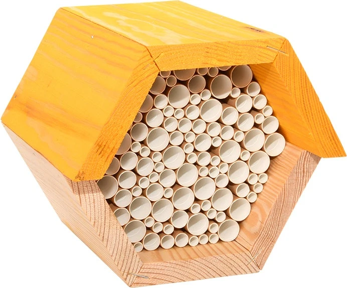 Dit bijenhuis van Esschert Design biedt een uitstekende nestgelegenheid voor verschillende soorten bijen. Een vrouwtjes bij maakt in een kartonnen rietje verschillende cellen met daarin een eitje en wat pollen en nectar voor de larf. Hang dit bijenhuis op een zonnige plek, gericht op het zuiden.