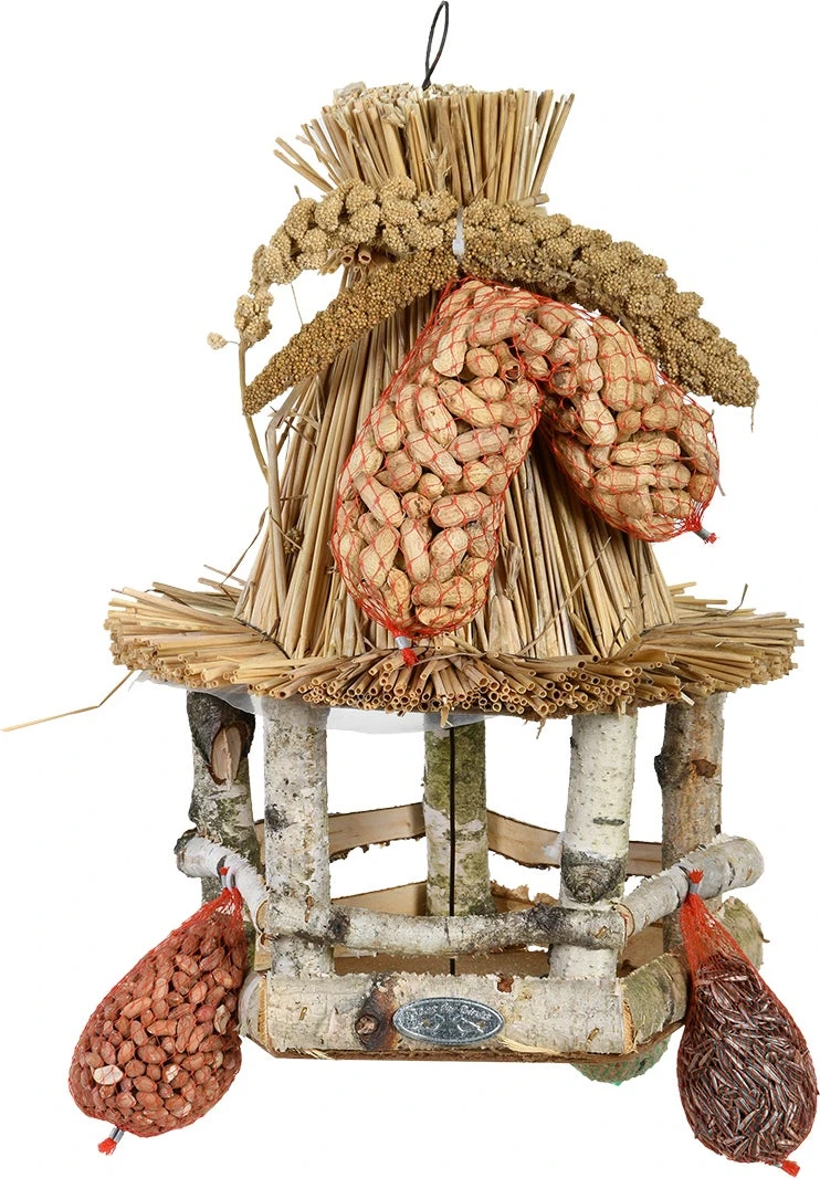 Lok vogels naar de tuin met deze hangende voedertafel inclusief vogelvoer. Dit pakket bestaat uit een voedertafel, 1 netje gestreepte zonnebloempitten, 2 netjes rode pinda’s, 1 netje doppinda’s, 2 stengels trosgierst en 1 vetbol.
