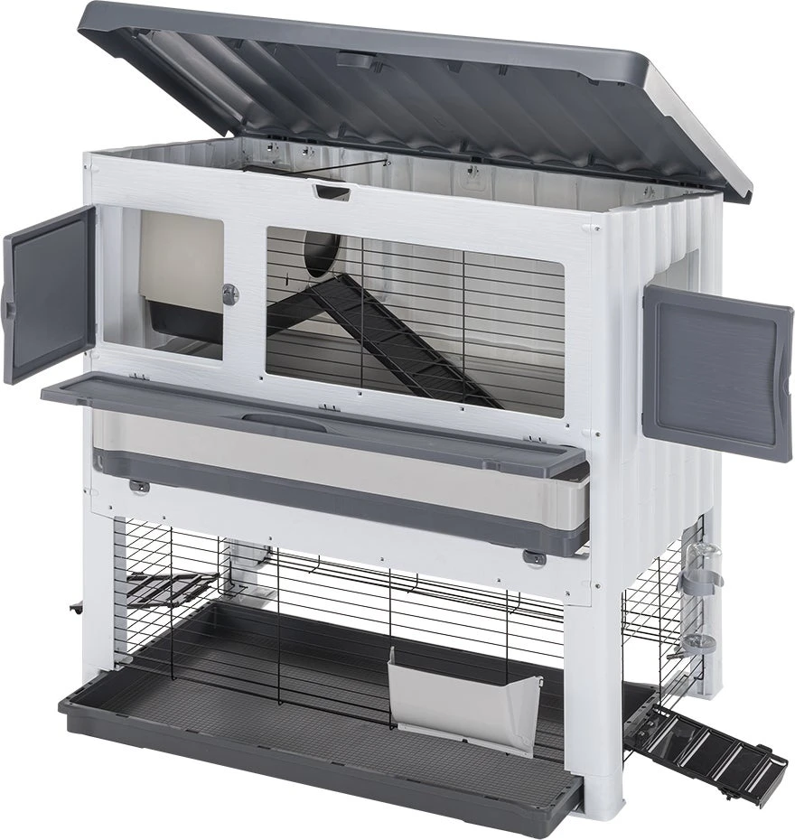 Het konijnenhok wordt geleverd met accessoires. De accessoires zijn een hooiruif, een drinkfles, een voerbak en houten ladders waarmee je konijn gemakkelijk de bovenste verdieping kan bereiken. Zorg ervoor dat deze meegeleverde accessoires altijd beschikbaar zijn in het verblijf van je konijn of knaagdier.