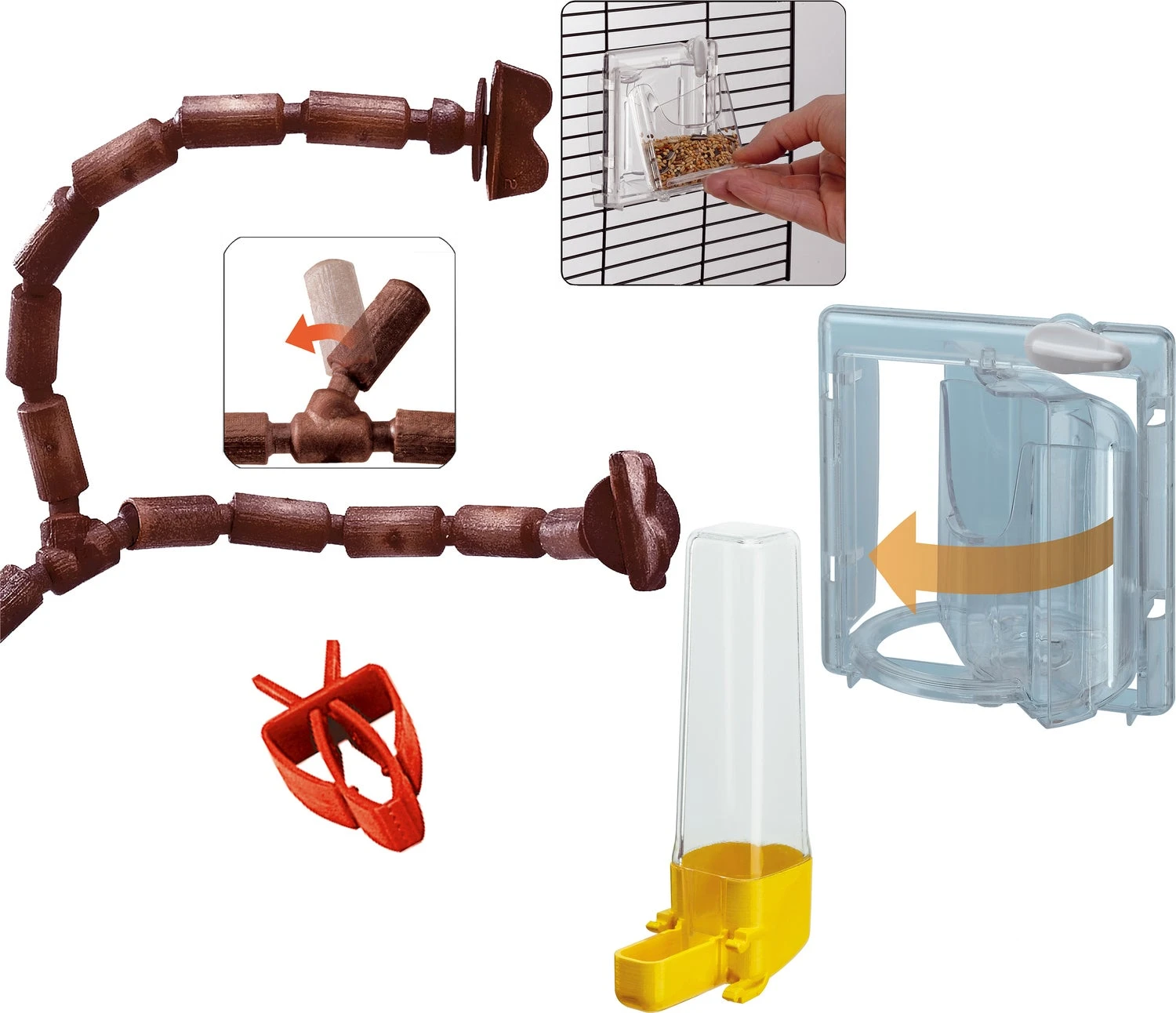 Binnenin vind je verwijderbare draaibare feeders, een drinkfles, een voedselclip voor groenten, evenals flexibele kunststof modulaire zitstokken die je grote vrijheid geven omdat je de vormen kan maken die jij verkiest.