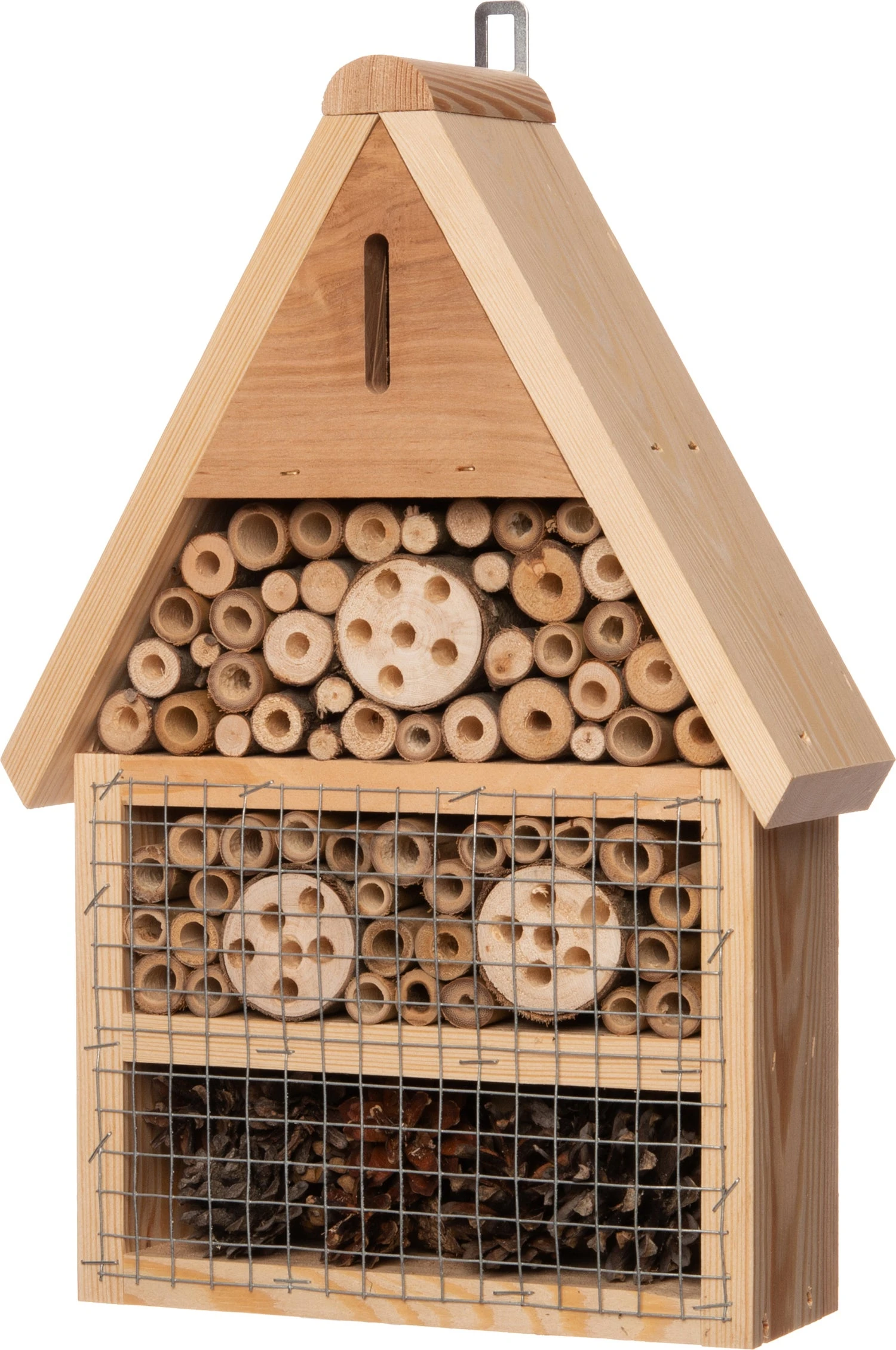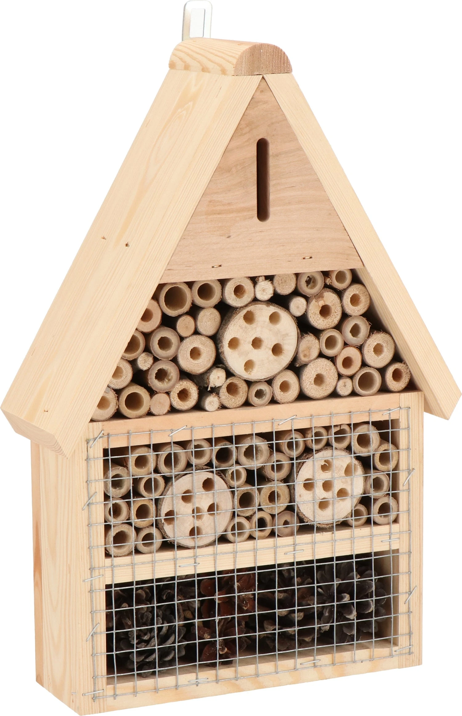Dit insectenhotel heeft een houten dak, is gemaakt van natuurlijk grenenhout en is onbehandeld. De 3 vakken zijn gevuld met bamboe, voorgeboorde hardhouten twijgen en kegels. Door de bijgevoegde beugel is dit insectenhotel eenvoudig op te hangen.