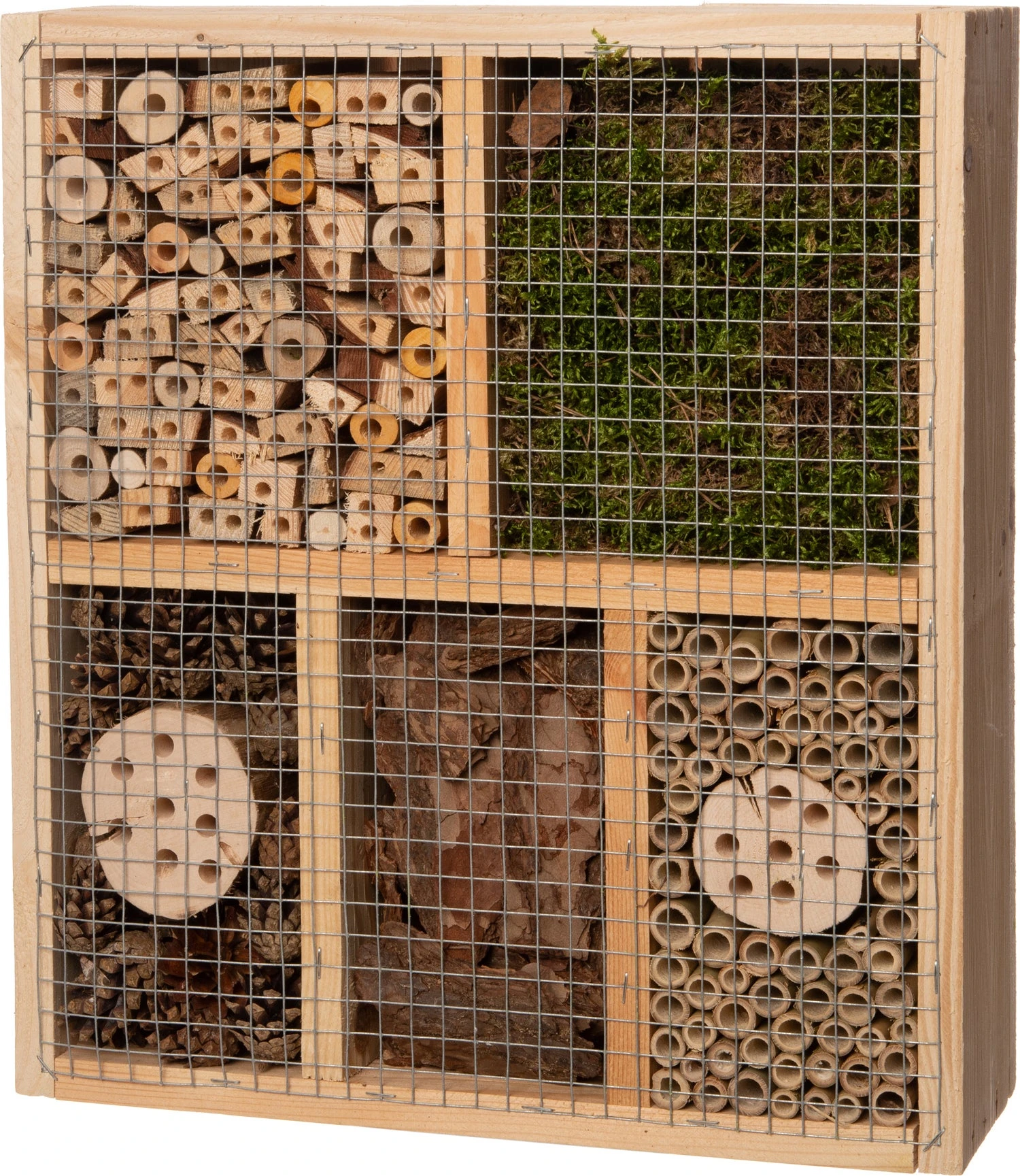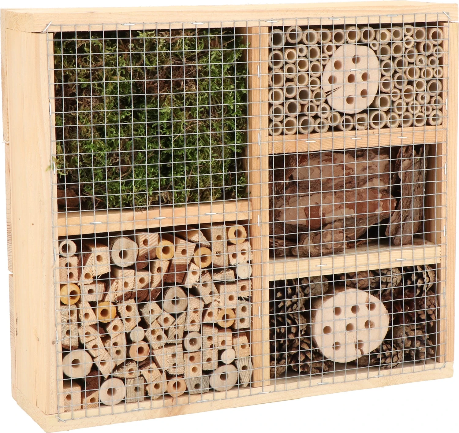 Dit insectenhotel is gemaakt van natuurlijk grenenhout en is onbehandeld. De 5 vakken zijn gevuld met bamboe, voorgeboorde hardhouten twijgen, mos, houten bast en kegels. Door de geboorde gaten aan de achterkant is dit insectenhotel eenvoudig op te hangen.
