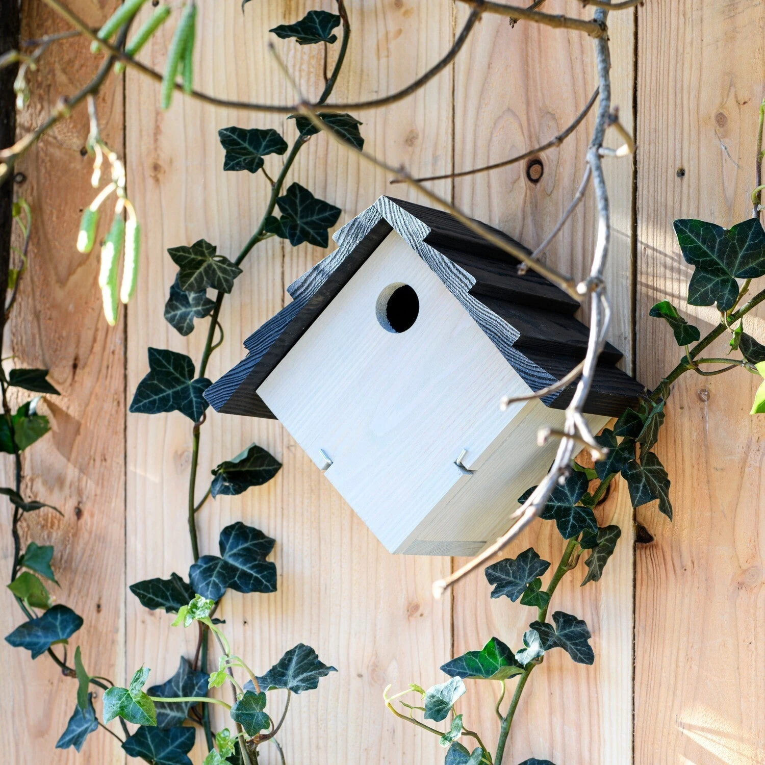 Deze tweekleurige nestkast van Intratuin heeft een invliegopening van 32 mm diameter, waardoor het geschikt is voor de boommus, huismus, pimpelmees, koolmees en de zwarte mees. Het dennenhout is behandeld met een niet giftige houtbeits op waterbasis. De voorkant is eenvoudig te openen voor reiniging. Hang de nestkast eenvoudig op aan een schroef of een spijker. In de achterkant zit een gaatje geboord.