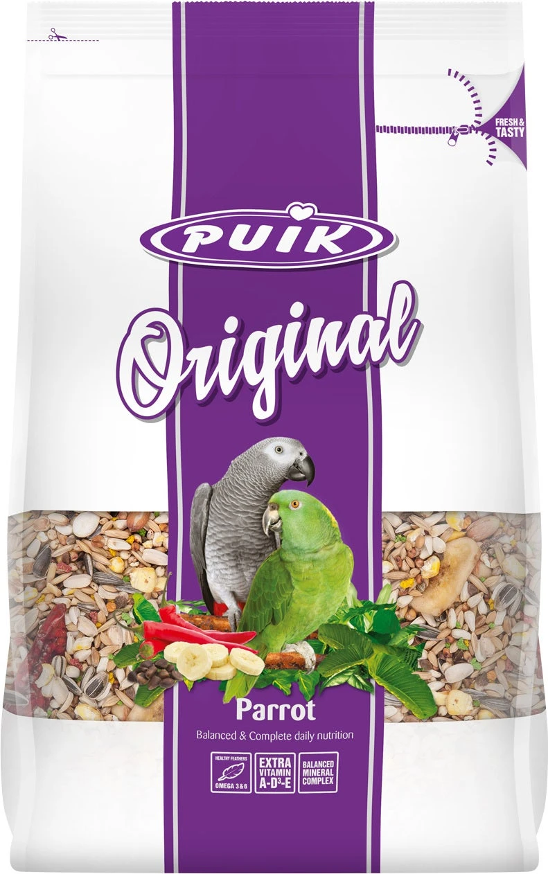Puik Original Papegaai is een uitgebalanceerde dagelijkse voeding voor papegaaien. Met fruit, noten en vruchten. Een zeer gevarieerd hoofdmenu voor papegaaien met maar liefst 22 verschillende ingrediënten. De omega 3- en 6-vetzuren ondersteunen de algehele gezondheid en dragen bij aan een gezond en glanzend verenpak. Bevat snoepkorrels met alle noodzakelijke vitaminen en mineralen. Het sinaasappelaroma bevordert een goede opname. Inhoud: 3,5 kg.