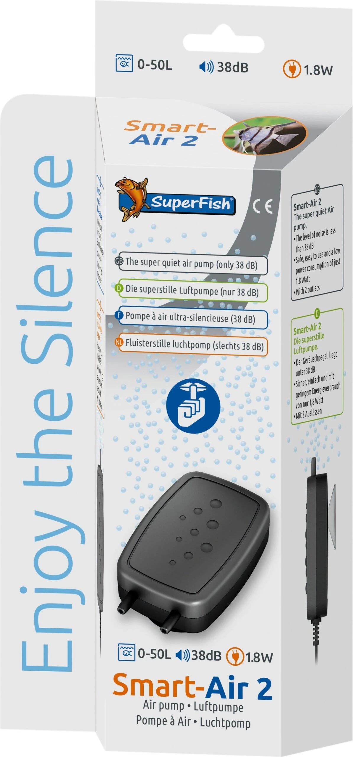 De aquarium luchtpomp Smart-Air 2 van SuperFish is de meest innovatieve en stille luchtpomp ter wereld. Nu kan je genieten van jouw aquarium hobby zonder vervelend geluid, want het geluidsniveau is slechts 38 dB. De Smart-Air is eenvoudig te installeren op het aquarium door de geïntegreerde zuignap.